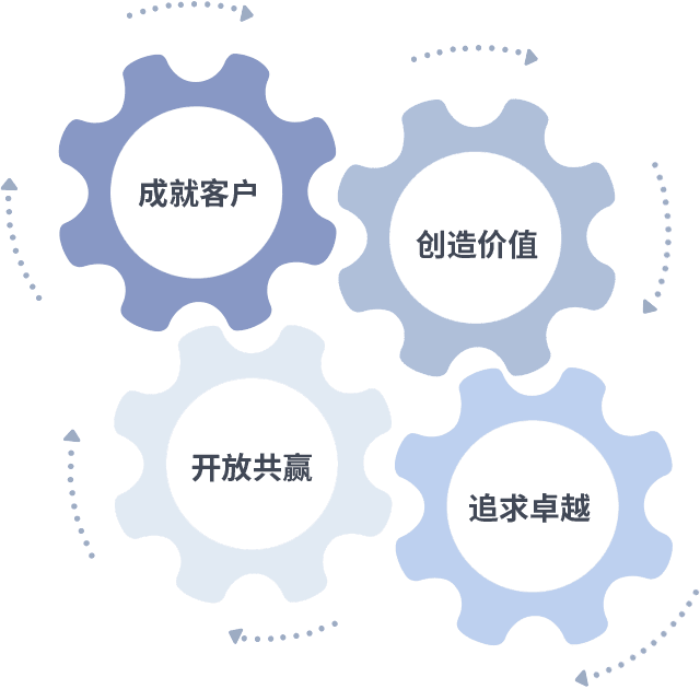 成就客户是一切决策的出发点,,,创造价值是衡量所有工作的标准,,,追求卓越是我们做事做人的态度,,,,开放共赢是我们的格局也是最终的结果。。。。价值观的齿轮环环相扣,,,推动着组织里的每个人不断向前。。
