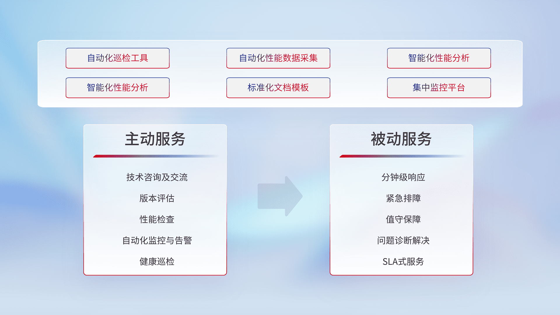 智能化工具和标准化文档,,,,保障服务质量,,,,提供主动服务(包含技术咨询、、版本评估、、、性能检查、、、自动化监控与告警、、、健康巡检)和被动服务包含(分钟级响应、、、、紧急排障、、、、值守保障、、、问题诊断解决、、、SLA服务)。。。。